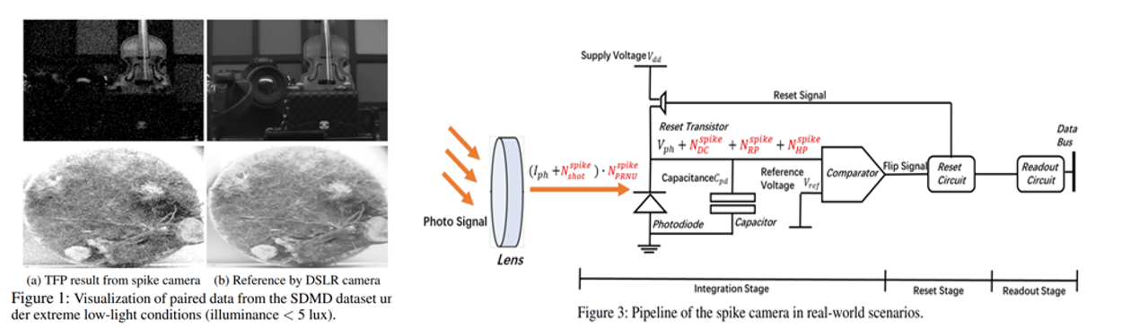 《Robust Noise Modeling for Spike Camera via Time-Interval Quantification and Spike-DSLR Multimodal Dataset in Low-Light Imaging》由曹越、李思照、张立国合作完成。论文针对脉冲相机极低光照条件下的噪声建模难题,提出基于时间间隔的噪声量化新方法,精确建模各间隔内各类噪声,并构建首个脉冲—单反相机多模态数据集(SDMD)。该方法显著提升噪声参数估计准确性,数据集为脉冲相机噪声模型评估提供了可靠真实参照基准。