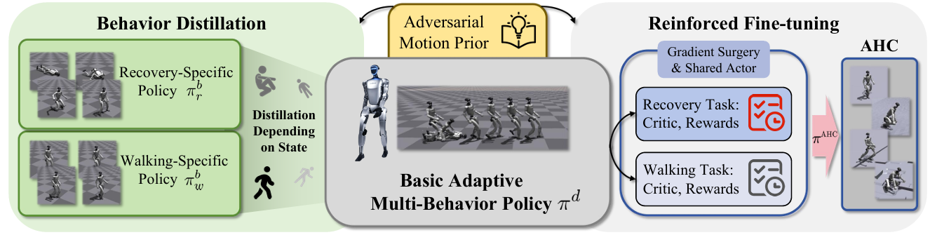 《Towards Adaptive Humanoid Control via Multi-Behavior Distillation and Reinforced Fine-Tuning》由赵英男、王鑫淼、王德玮、刘昕哲、卢丹、韩启龙、刘鹏、白辰甲合作完成。论文聚焦人形机器人复杂地形多行为自适应控制问题,提出两阶段训练框架 AHC,通过多行为蒸馏融合基础策略、强化微调适配多样地形,引入行为特定评论家与梯度投影机制缓解梯度冲突。该框架在 Isaac Gym 仿真环境训练并部署于 Unitree G1 实体机器人,多种地形行走与跌倒恢复任务成功率显著优于基线方法,展现出良好的多行为融合与地形适应能力。