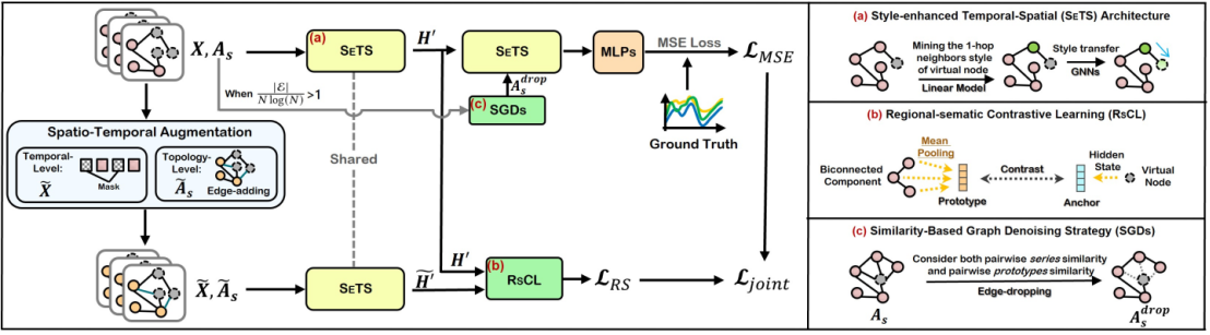 《DarkFarseer: Robust Spatio-temporal Kriging under Graph Sparsity and Noise》由梁焯炫、李伟、张大林、贾子钰、陈一丹、王志宏、郑香平、Moustafa Youssef 合作完成。论文聚焦图稀疏与噪声条件下的时空插值问题,提出稳健框架 DARKFARSEER,采用“时间优先”建模与时间风格迁移机制,通过区域语义对比学习提升节点表示,基于节点时空相似度降低图噪声。该框架在交通、气象等五个真实数据集上,相关评估指标显著优于七种最新基线模型,具备更强鲁棒性、可扩展性与泛化性能。